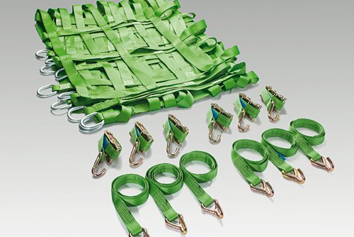 The set includes a webbing net made of high-strength polyester (mesh size 300 mm), eight matching tension belts and a detailed instruction manual. The webbing net is GS tested and is manufactured according to VDI 2700ff and DIN EN 12195-2.