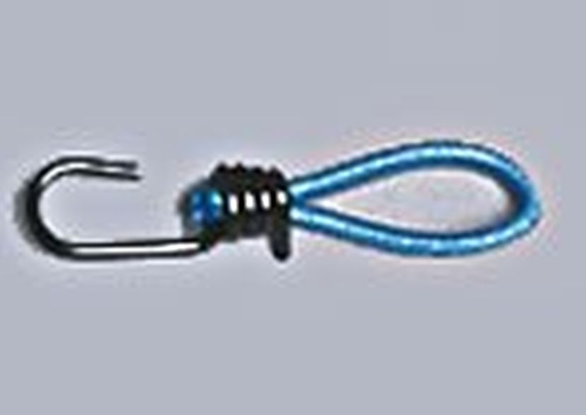 Spannschlaufen aus einer ca. 6 mm starken Gummileine und kunststoffüberzogenem Stahlhaken.